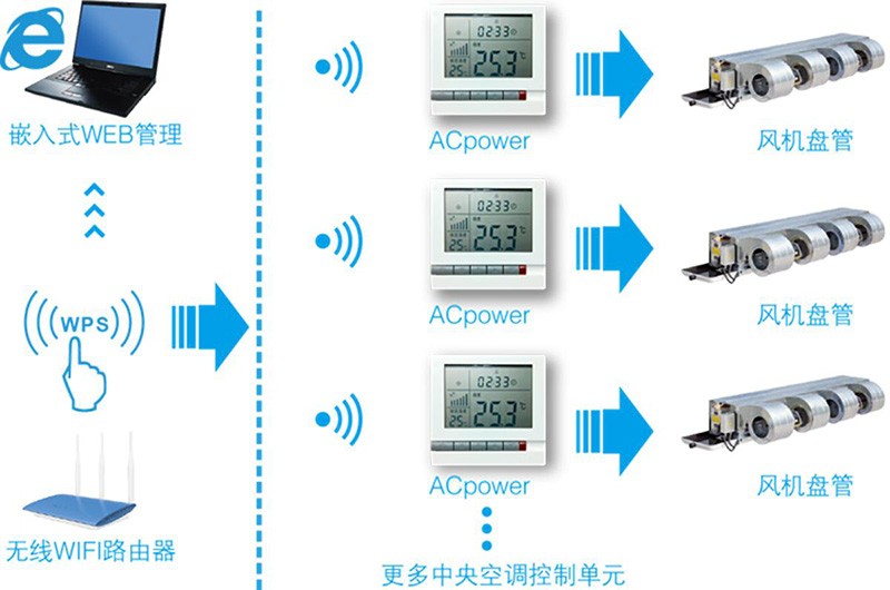 ZHT-ACpower是深圳縱橫通公司自主研發(fā)的智能型中央空調(diào)溫控器,配備大LCD 人機(jī)交互界面, 內(nèi)置嵌入式WEB,支持無線WIFI 通信,組網(wǎng)方便、簡單;并實(shí)時(shí)與用戶設(shè)定溫度進(jìn)行比較,自動(dòng)調(diào)節(jié)風(fēng)機(jī)的風(fēng)量和開、關(guān)管道電動(dòng)閥,達(dá)到維持室內(nèi)恒溫的目的。廣泛應(yīng)用于中央空調(diào)及采暖或制冷系統(tǒng)的風(fēng)機(jī)盤管、電熱器、熱泵機(jī)組等溫度控制系統(tǒng)。
